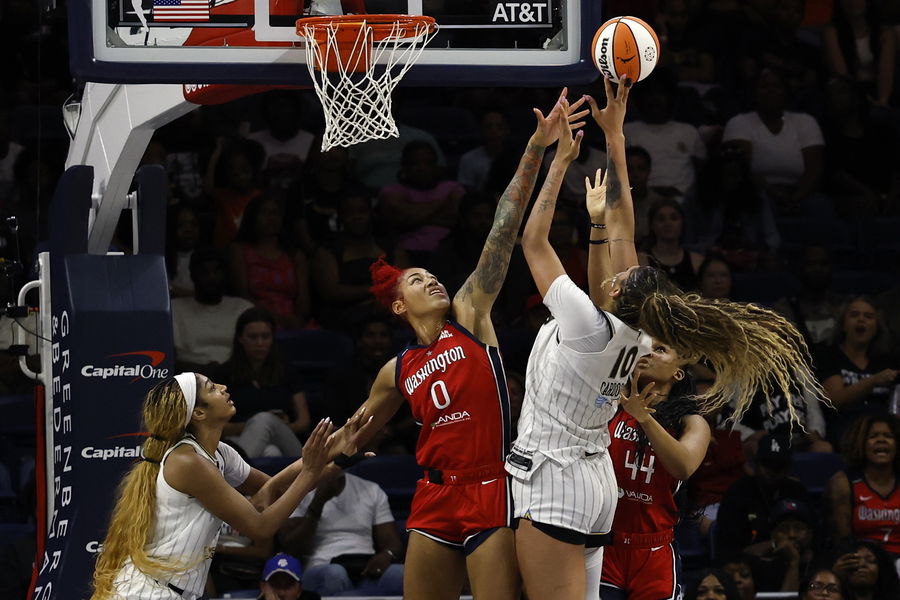 Jul 29, 2025; Washington, District of Columbia, USA; Chicago Sky center Kamilla Cardoso (10) shoots the ball as Washington Mystics forward Shakira Austin (0) and Mystics forward Kiki Iriafen (44) defend in the second half at CareFirst Arena. Mandatory Credit: Geoff Burke-Imagn Images