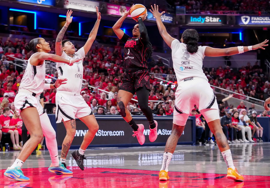 Indiana Fever guard Odyssey Sims (1) is defended by Las Vegas Aces center A’ja Wilson (22), forward Kierstan Bell (1) and forward NaLyssa Smith (3) as she shoots the ball during Game 4 of the WNBA semifinals on Sunday, Sept. 28, 2025, at Gainbridge Fieldhouse in Indianapolis. The Fever defeated the Aces 90-83.
