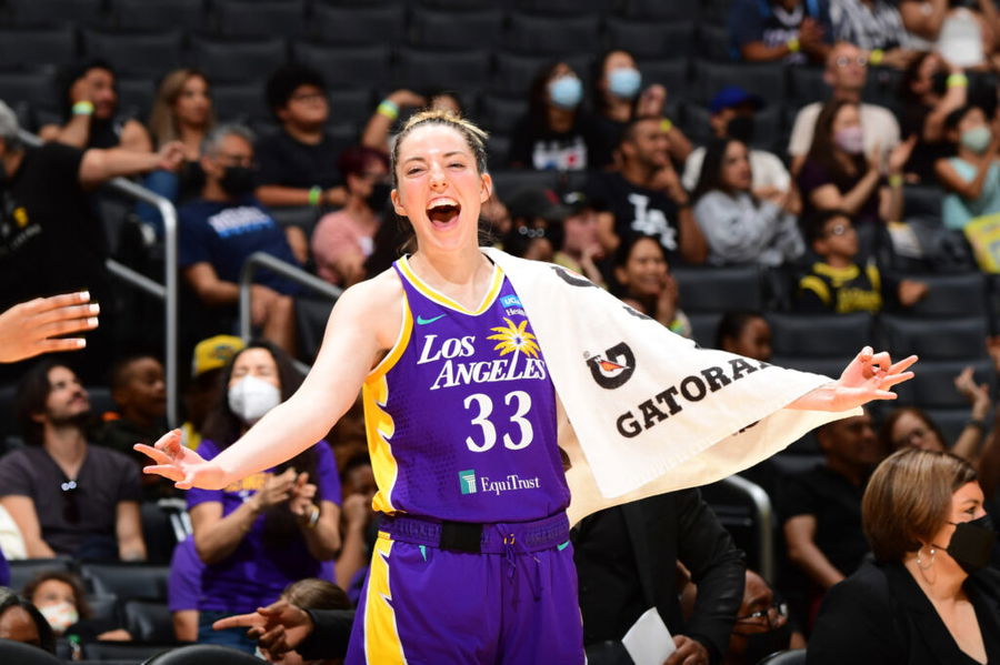 LOS ANGELES, CA – JULY 19: Katie Lou Samuelson #33 of the Los Angeles Sparks celebrates a 3 point basket during the game against the Indiana Fever on July 19, 2022 at Crypto.Com Arena in Los Angeles, California. NOTE TO USER: User expressly acknowledges and agrees that, by downloading and/or using this Photograph, user is consenting to the terms and conditions of the Getty Images License Agreement. Mandatory Copyright Notice: Copyright 2022 NBAE (Photo by Adam Pantozzi/NBAE via Getty Images)