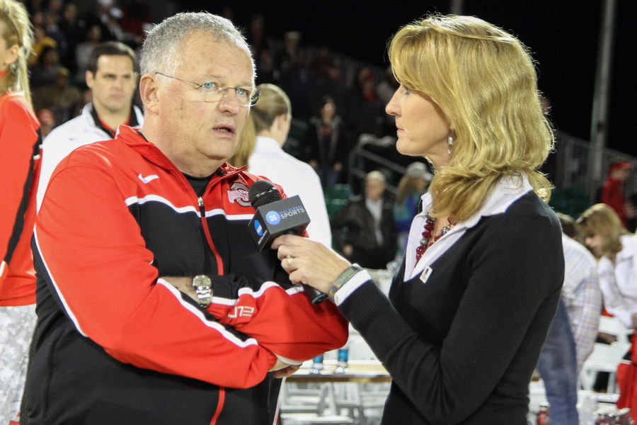 Nov 9, 2012; Mount Pleasant, SC, USA; Ohio State Buckeyes head coach Jim Foster talks with Debbie Antonelli after being defeated by the Notre Dame Fighting in the 2012 Carrier Classic on the USS Yorktown. The Irish defeated the Buckeyes 57-51. Mandatory Credit: Jeremy Brevard-USA TODAY Sports