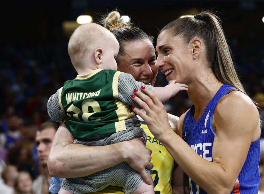 Paris 2024 Olympics – Basketball – Women’s Group Phase – Group B – Australia vs France – Lille, Pierre Mauroy Stadium, Villeneve-d’Ascq, France – August 04, 2024. Sami Whitcomb of Australia holds a child after the team’s win, next to Romane Bernies of France. REUTERS/Evelyn Hockstein