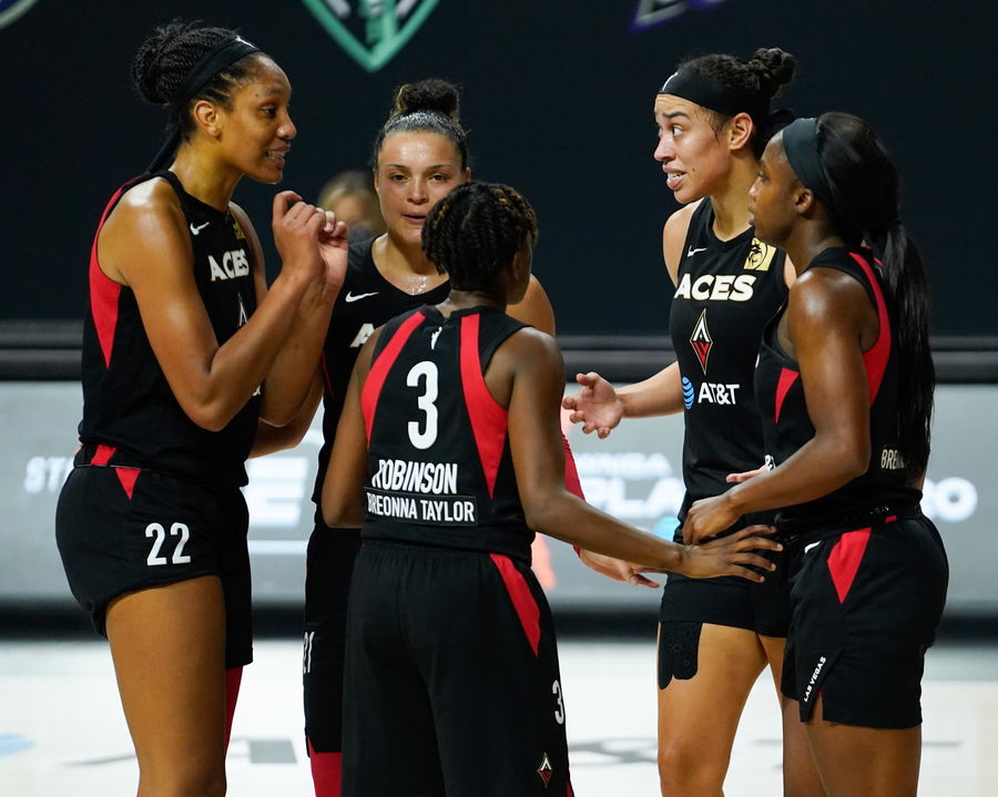 Sep 22, 2020; Bradenton, Florida, USA; Las Vegas Aces center A’ja Wilson (22) reacts with teammates during the first half against the Connecticut Sun at IMG Academy. Mandatory Credit: Douglas DeFelice-USA TODAY Sports