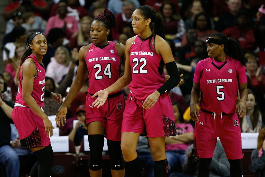 Feb 18, 2016; Columbia, SC, USA; South Carolina Gamecocks guard Khadijah Sessions (5), center Sarah Imovbioh (24), forward A’ja Wilson (22), and guard Tiffany Mitchell (25) during the game between the South Carolina Gamecocks and the Georgia Bulldogs at Colonial Life Arena. With a 61-51 victory the Gamecocks clinch the SEC Championship for the third year. Mandatory Credit: Jim Dedmon-USA TODAY Sports